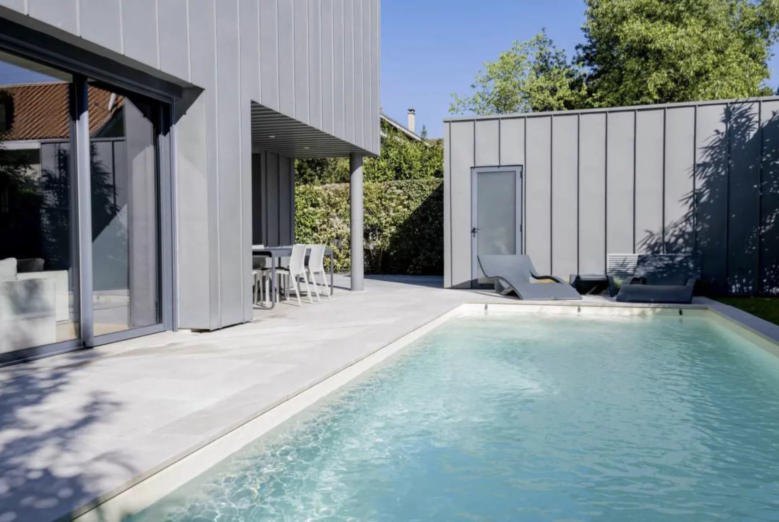 En rez-de-chaussée, entrée, pièce de vie lumineuse en open de 70m2 incluant cuisine entièrement équipée / salle à manger / séjour, ouvrant sur la piscine chauffée et la terrasse en pierres naturelles "de belle facture" (!), ainsi qu'une suite avec salle d’eau / dressing et toilettes indépendants. Buanderie. Accès à la cave.