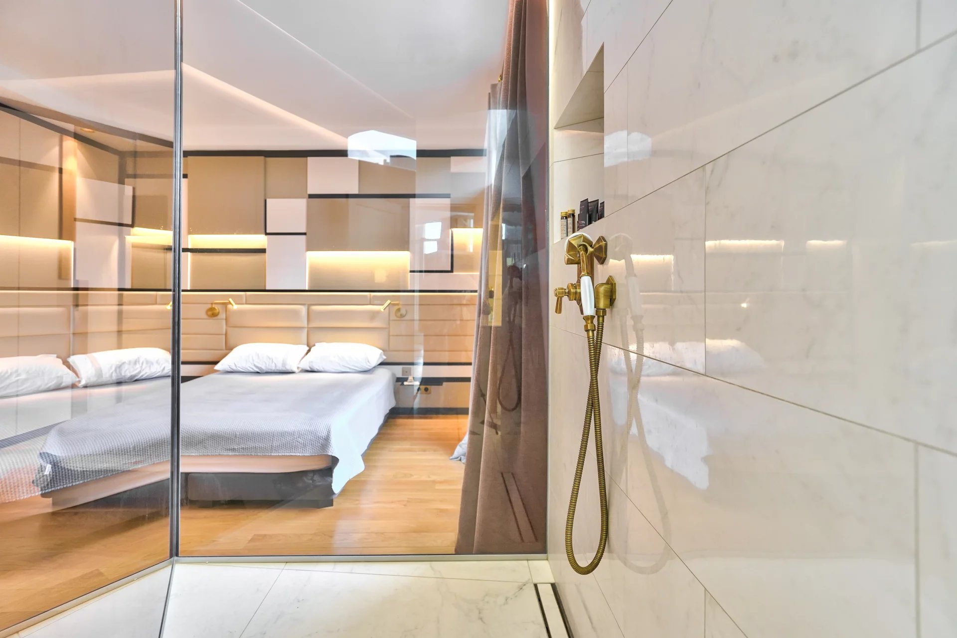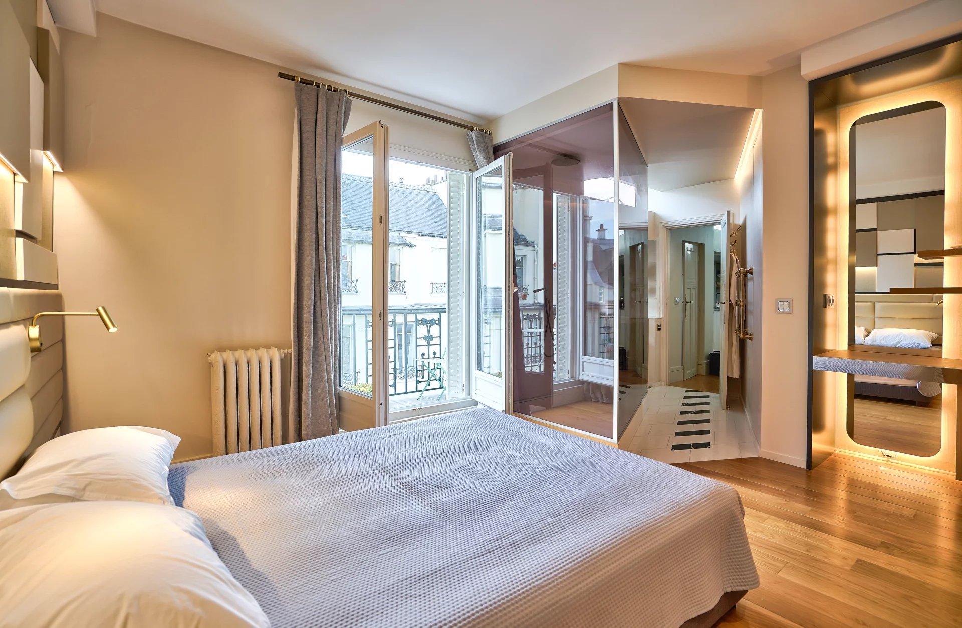 La chambre, aérée et au calme, profite elle aussi d'un balcon-terrasse avec vue directe sur la Tour Eiffel. La salle de douche attenante à la chambre offre un espace bien-être optimisé et décoré avec goût.
