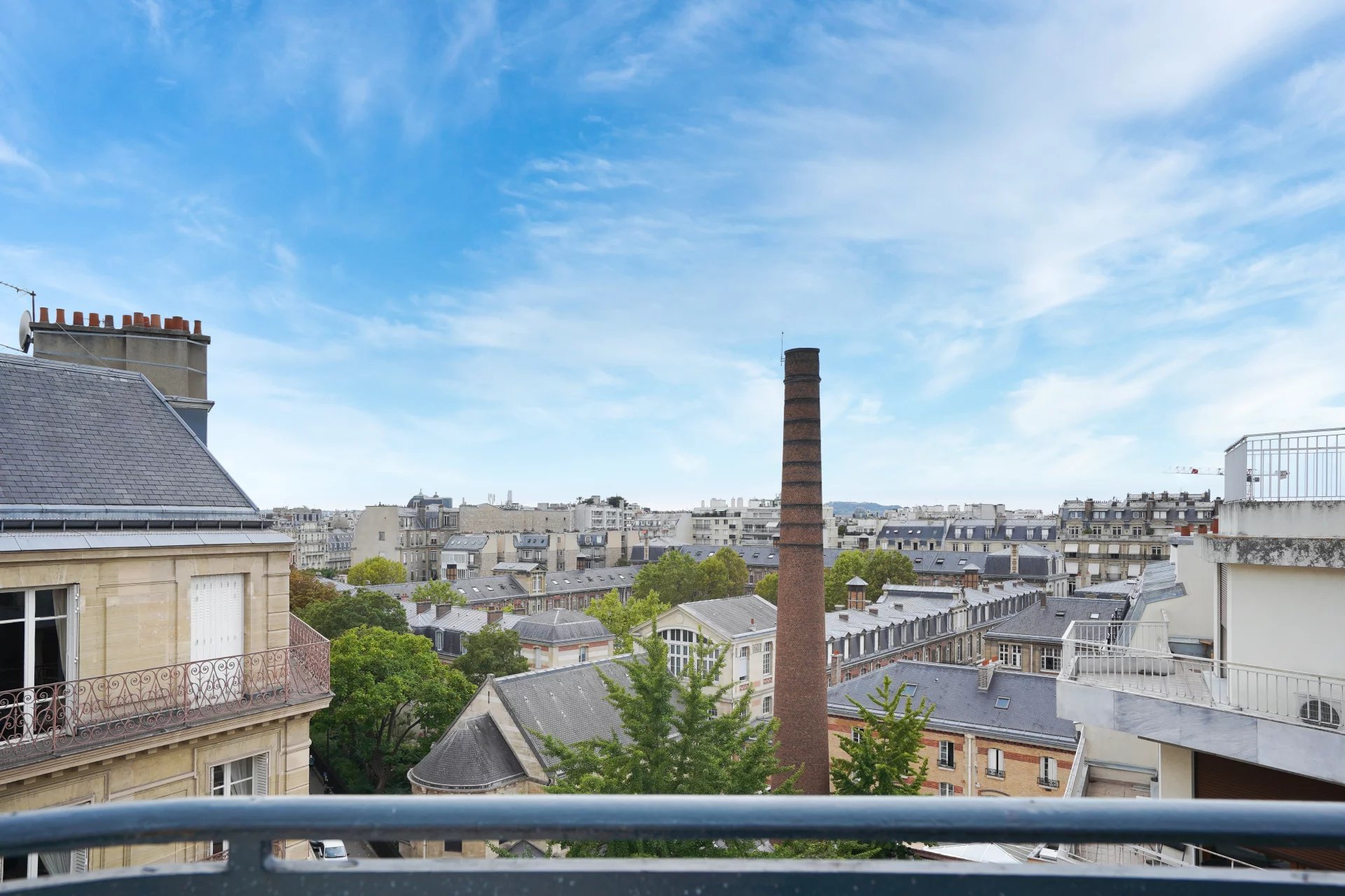 La double exposition Nord-Ouest & Sud-Ouest offre à cet appartement une belle luminosité avec vue sur les toits parisiens et la Tour Eiffel depuis les multiples balcons.