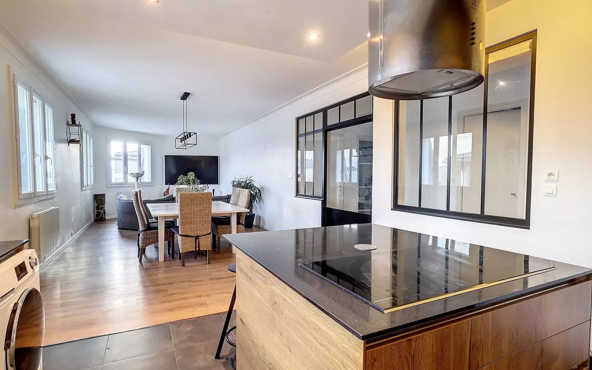 Niché au dernier étage — le troisième — d’une petite copropriété en dalle béton, ce bel appartement de type 5, entièrement rénové avec soin et des matériaux de qualité, offre une qualité de vie rare et précieuse.
