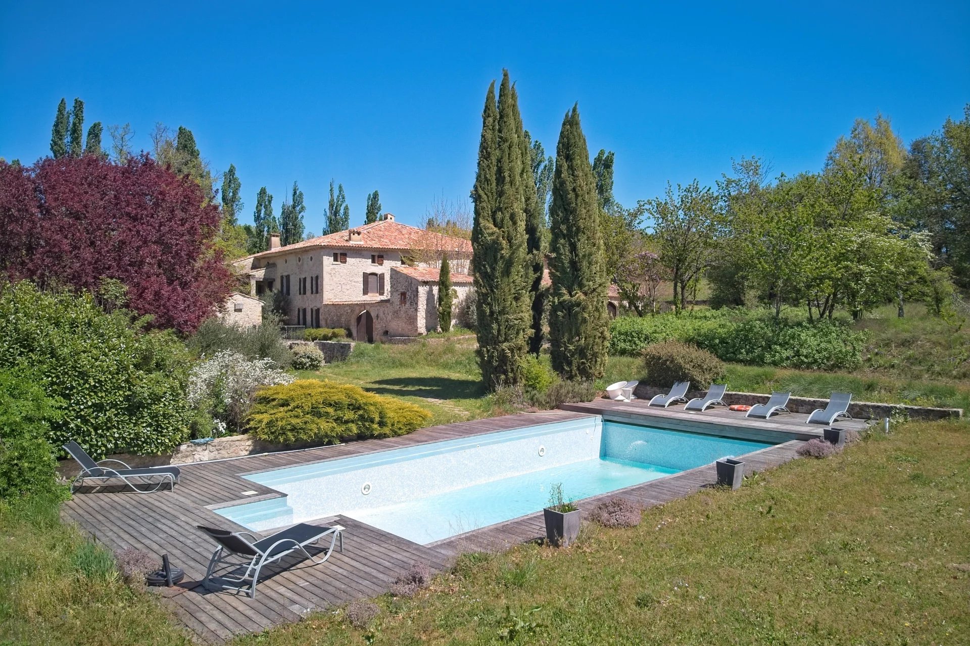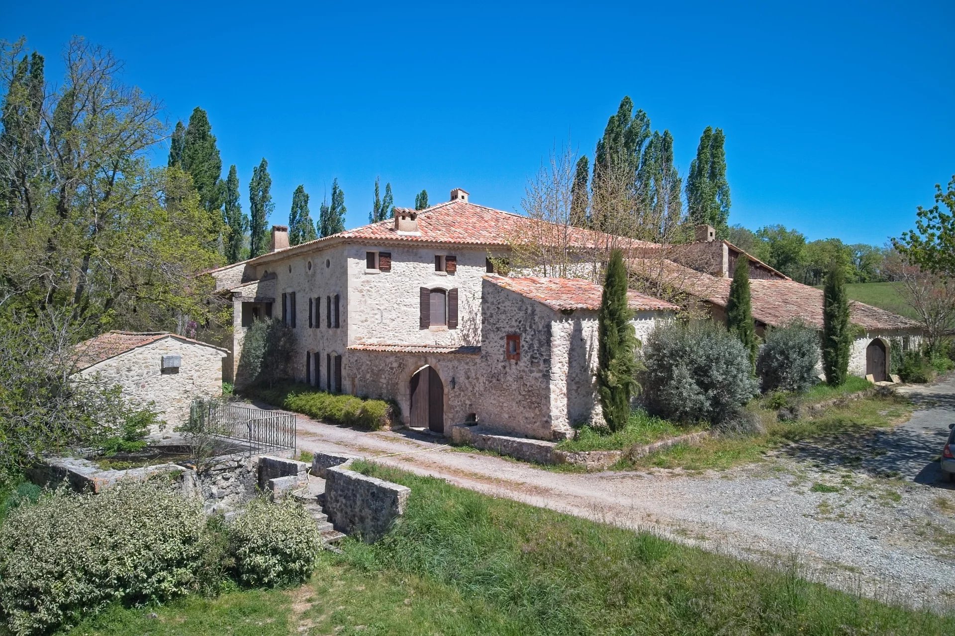 La bâtisse principale, nichée dans un environnement verdoyant, comprend une cour avec un platane centenaire, un barbecue et un ancien pigeonnier. Elle offre :