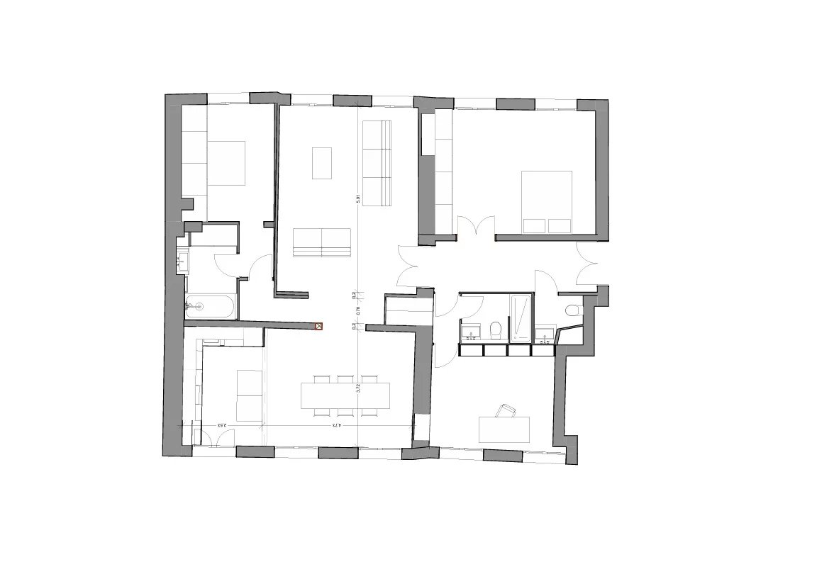 Une entrée mène à un salon chaleureux prolongé par une salle à manger avec cuisine ouverte, offrant un espace convivial et lumineux. Côté cour, deux chambres paisibles assurent confort et tranquillité, tandis qu’un bureau sur rue peut également être aménagé en troisième chambre selon les besoins. L’appartement comprend par ailleurs une salle de bains, une salle de douche avec toilettes ainsi que des toilettes invités.